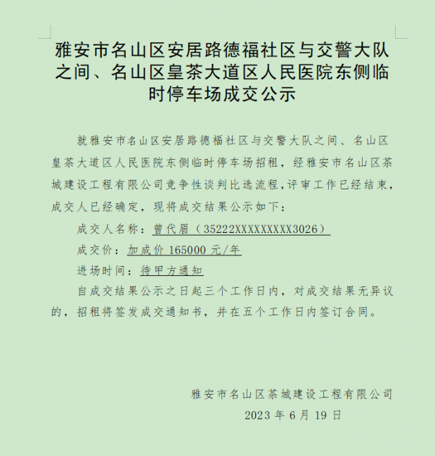 雅安市名山區(qū)安居路德福社區(qū)與交警大隊之間、名山區(qū)皇茶大道區(qū)人民醫(yī)院東側(cè)臨時停車場成交公示